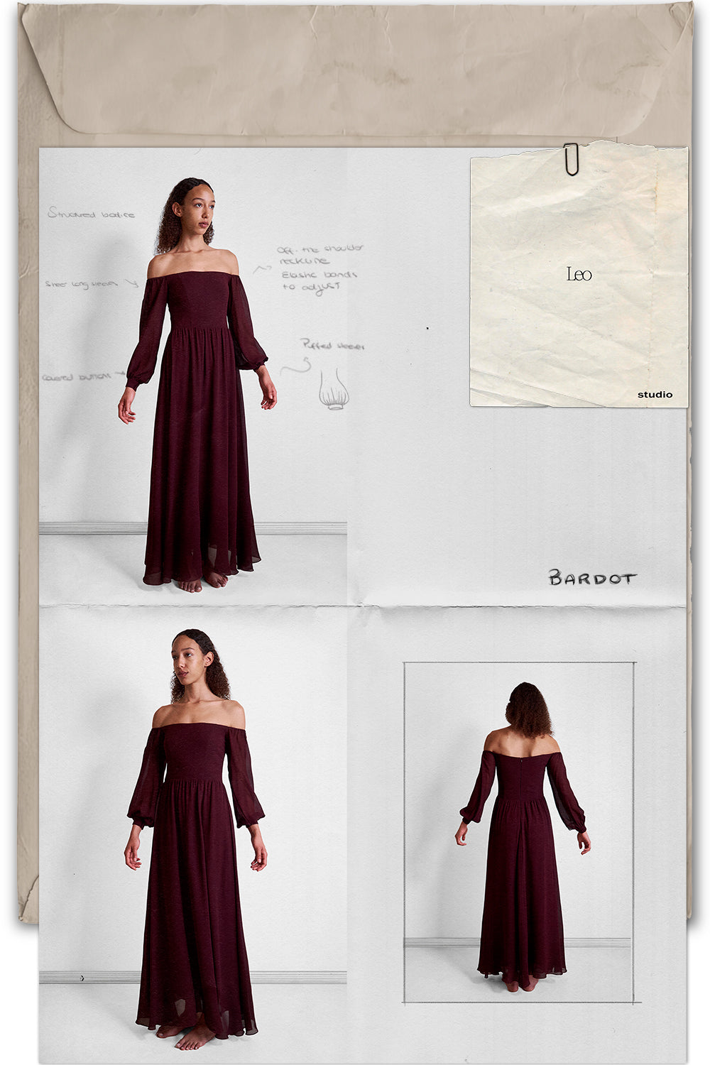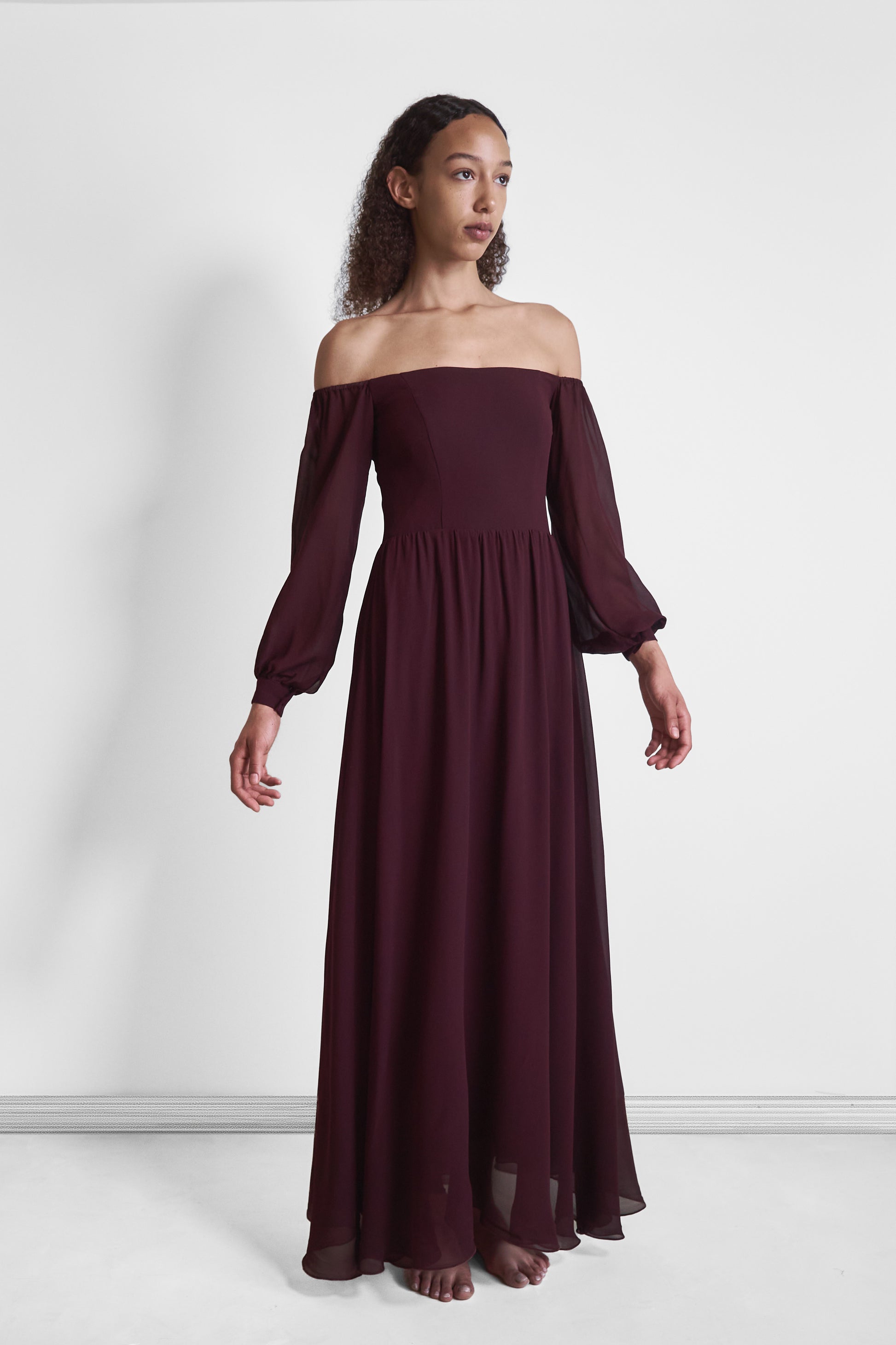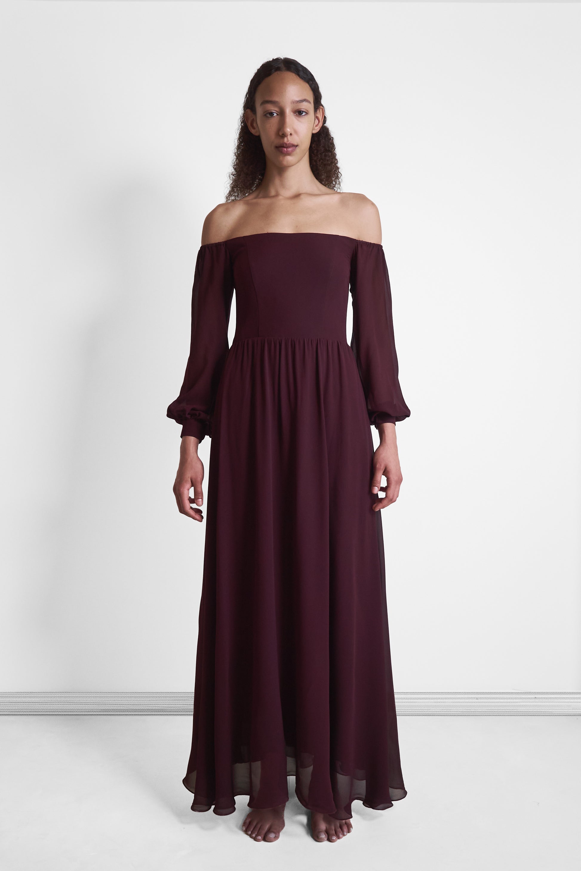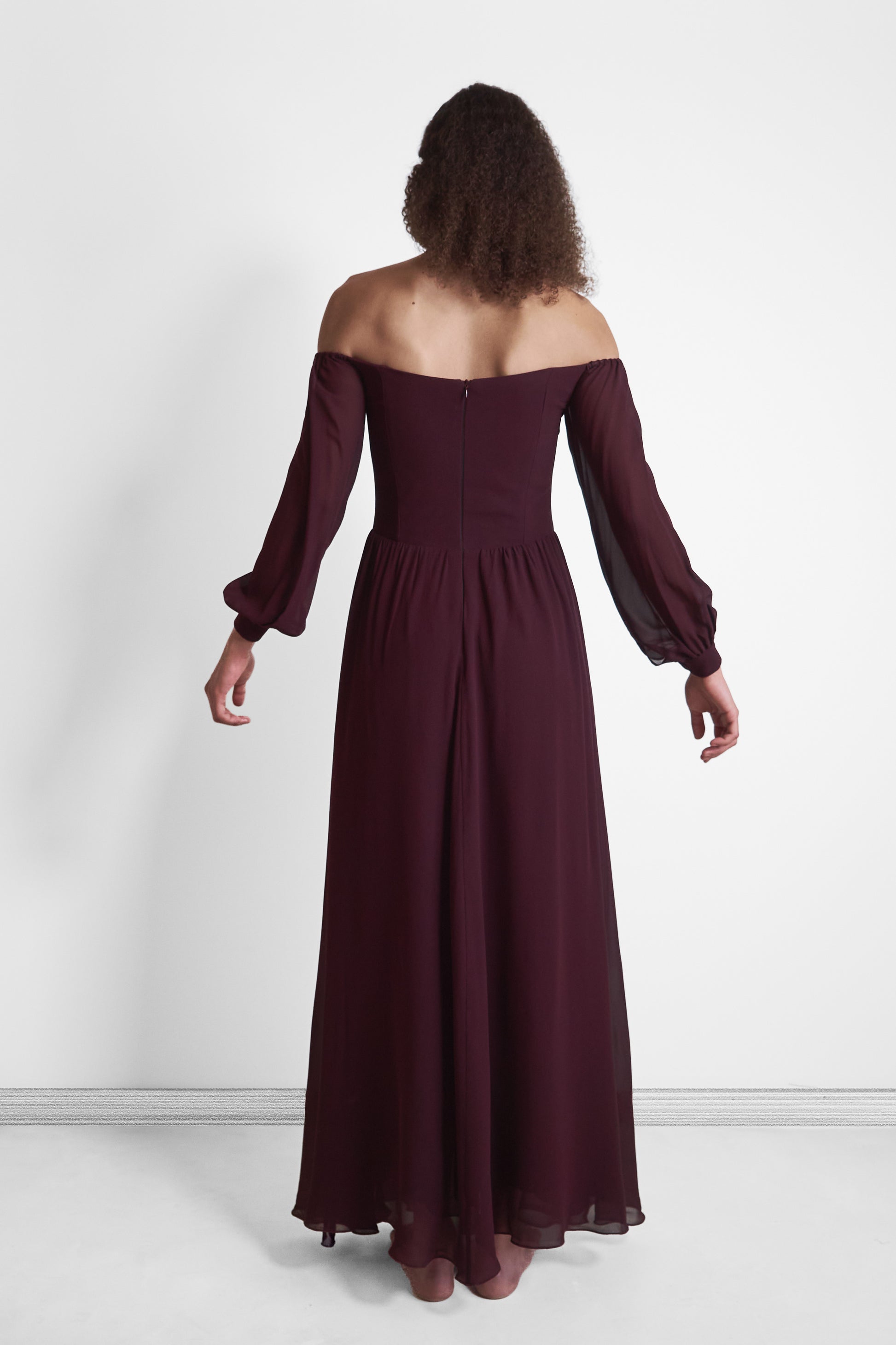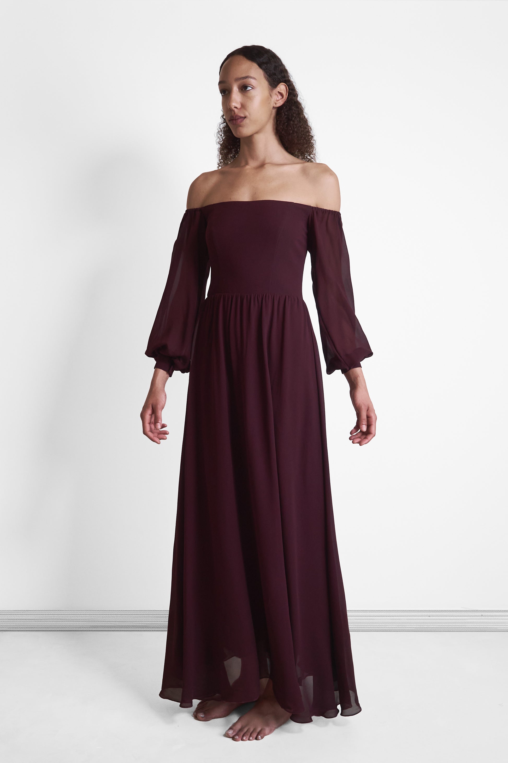 The Bardot gown is a floor-length evening dress featuring an off-the-shoulder neckline, sheer long sleeves, and a flowing chiffon skirt. Designed in luxurious 100% silk crepe georgette.